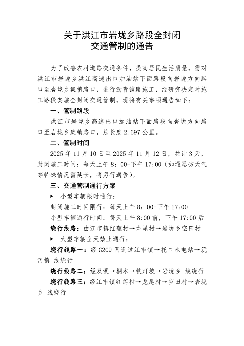 關于洪江市巖垅鄉路段全封閉交通管制的通告