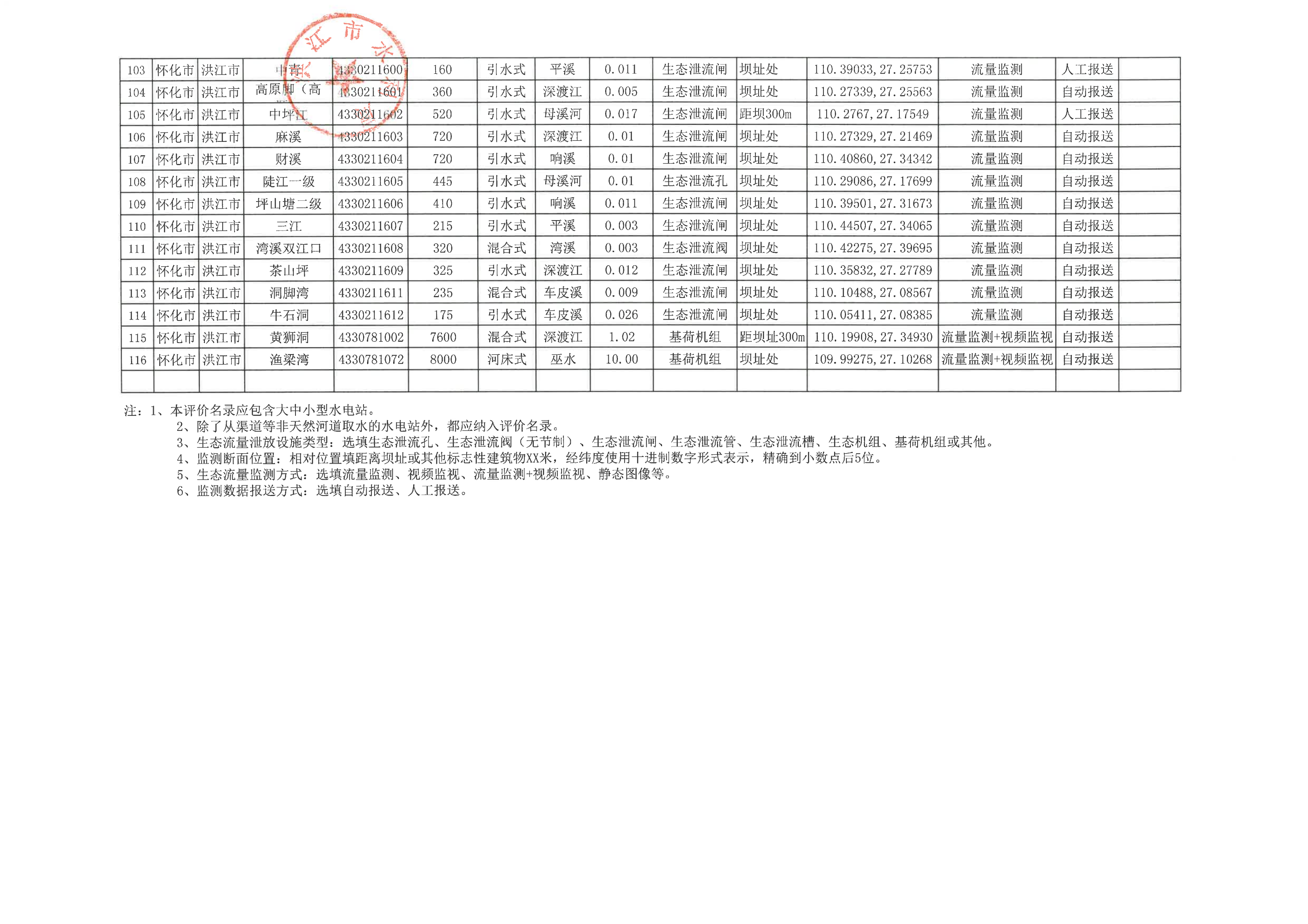 洪江市水電站生態流量評價名錄公示