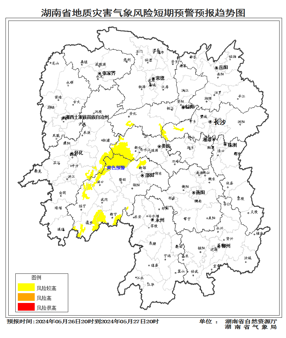 根據(jù)地質(zhì)災(zāi)害成災(zāi)規(guī)律和孕災(zāi)條件,結(jié)合2024年5月26日短期氣象預(yù)報(bào)情況,省自然資源廳與省氣象局聯(lián)合會(huì)商得出如下結(jié)論:自5月26日20:00至27日20:00,受降雨影響,湘中、湘西南部分區(qū)域發(fā)生突發(fā)性地質(zhì)災(zāi)害風(fēng)險(xiǎn)較高(黃色預(yù)警)。