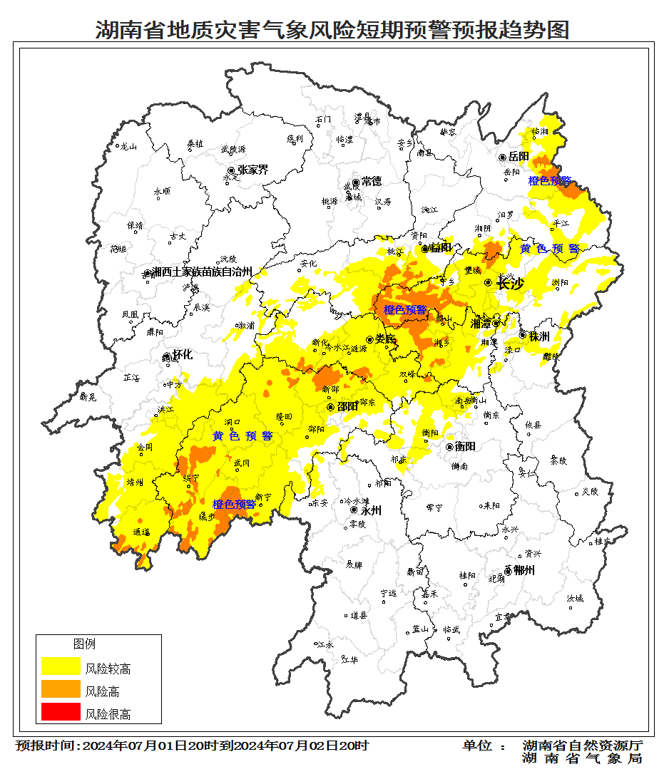 根據(jù)地質(zhì)災(zāi)害成災(zāi)規(guī)律和孕災(zāi)條件,結(jié)合2024年7月1日短期氣象預(yù)報(bào)情況,省自然資源廳與省氣象局聯(lián)合會(huì)商得出如下結(jié)論:自7月1日20:00至2日20:00,受降雨影響, 湘東北、湘中、湘西南部分區(qū)域發(fā)生突發(fā)性地質(zhì)災(zāi)害風(fēng)險(xiǎn)高(橙色預(yù)警),湘東北、湘中、湘西南大部分區(qū)域發(fā)生突發(fā)性地質(zhì)災(zāi)害風(fēng)險(xiǎn)較高(黃色預(yù)警)。