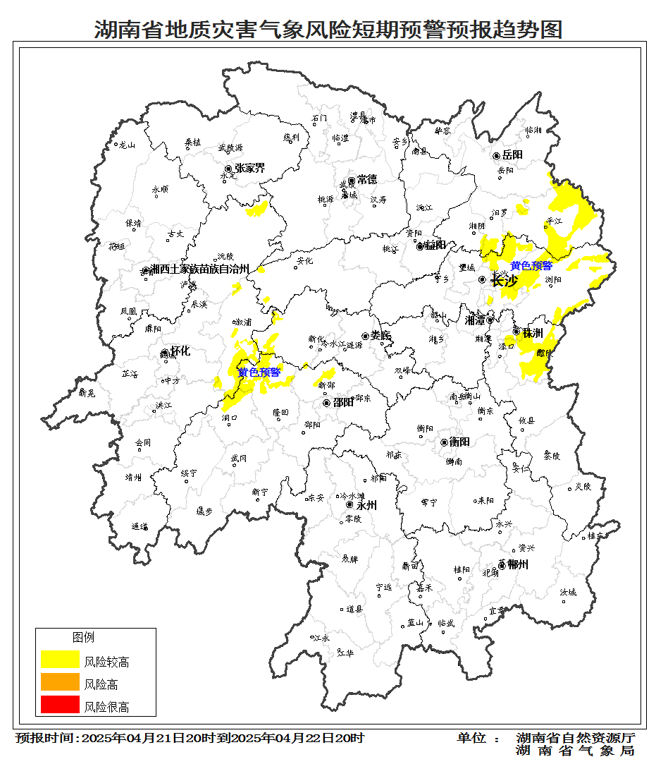 根據(jù)地質(zhì)災(zāi)害成災(zāi)規(guī)律和孕災(zāi)條件,結(jié)合2025年4月21日 短期氣象預(yù)報情況,省自然資源廳與省氣象局聯(lián)合會商得出如下結(jié)論:自4月21日20:00至22日20:00,受降雨影響,湘西北益陽、懷化,湘東北長沙、岳陽、株洲,湘中邵陽、婁底等市州山地丘陵區(qū)發(fā)生突發(fā)性地質(zhì)災(zāi)害風(fēng)險較高黃色預(yù)警。