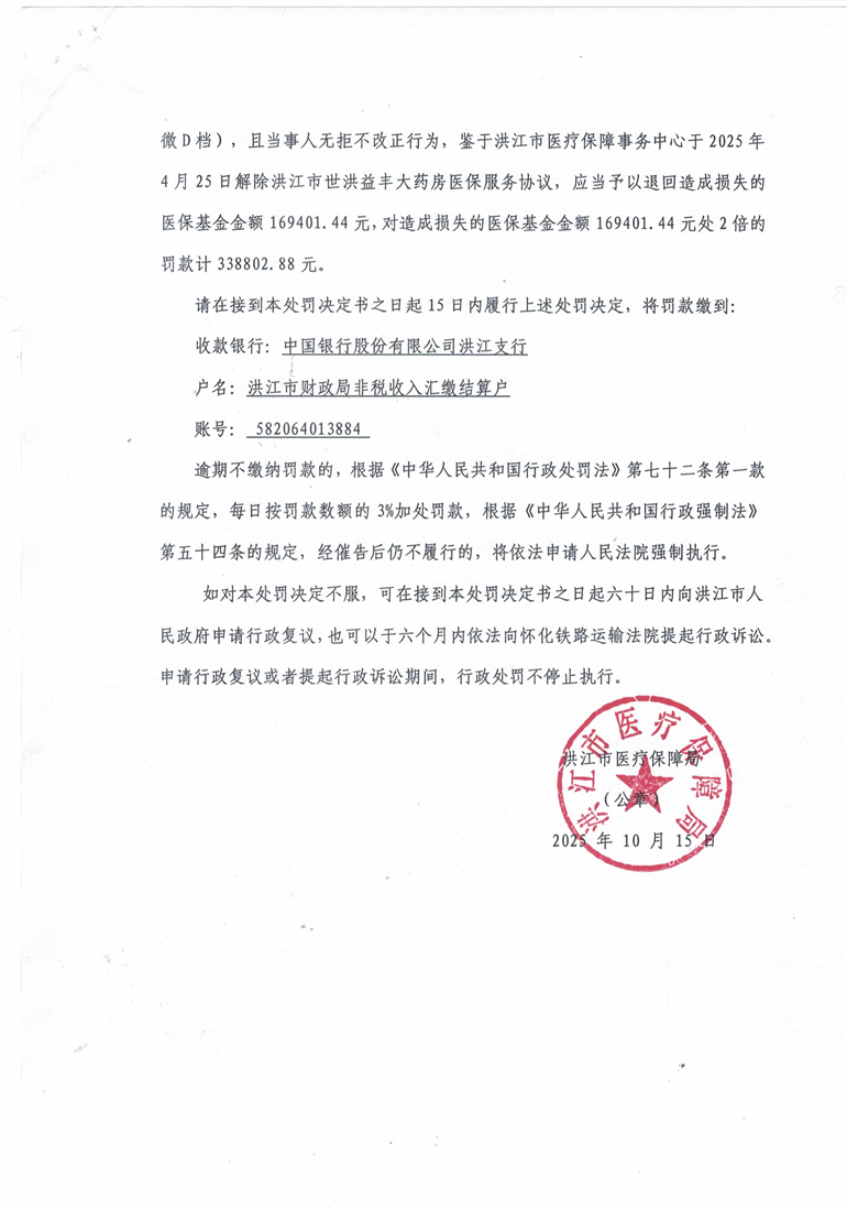 關于洪江市世洪益豐大藥房的行政處罰決定書