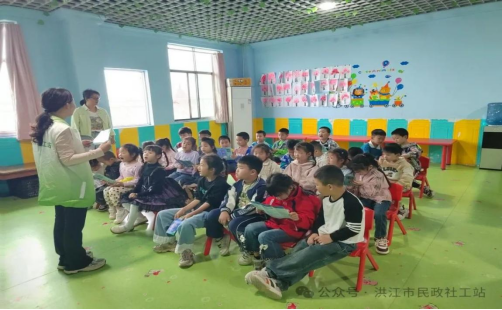 活動現場,社工和托口鎮政府工作人員化身“安全老師”,采用生動有趣的方式,結合幼兒的認知特點,通過播放動畫視頻、情景模擬、互動問答等形式,將防溺水、防性侵、防欺凌知識融入其中。