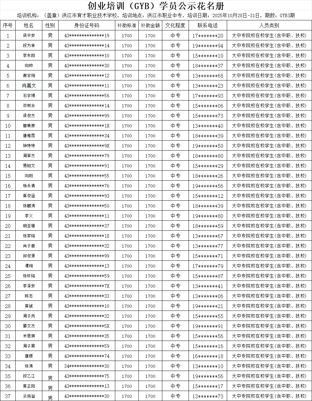 創業培訓班公示花名冊-公示-GYB3期292班