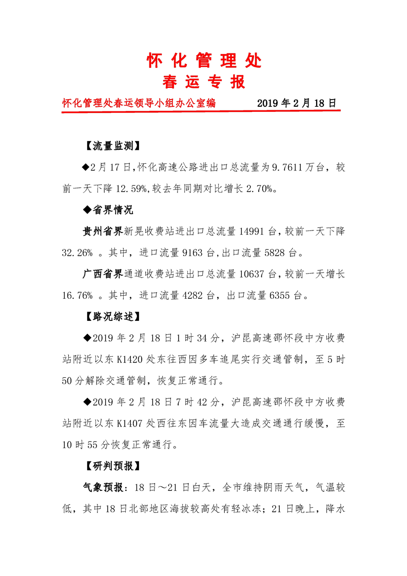 2019年懷化市高速公路春運專報(第27期)