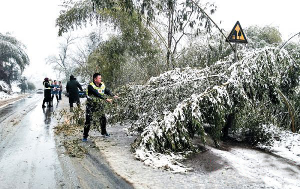 1月16日,受雨雪天氣影響,308省道麻陽呂家坪鎮(zhèn)塘坊段道路兩側(cè)竹木被壓彎,侵占道路,...