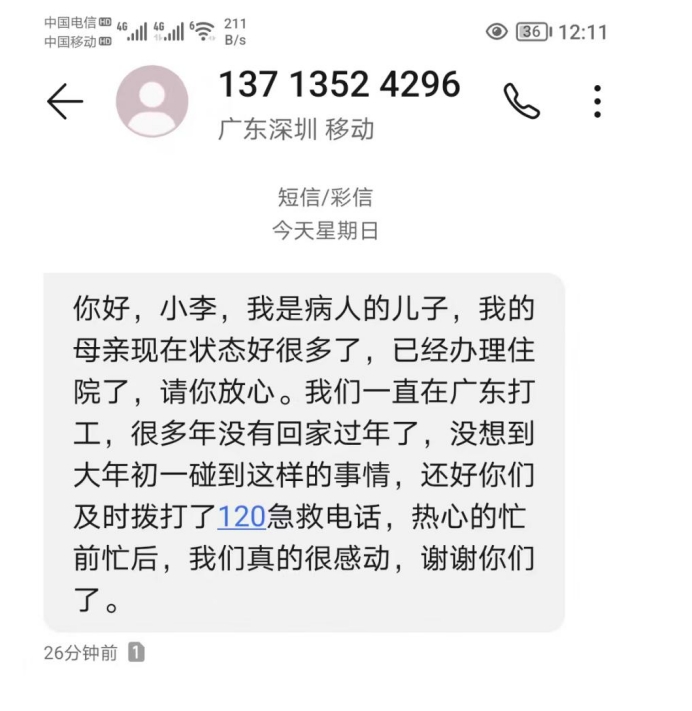 待老人各項體征平穩(wěn)后,收費(fèi)班長李高強(qiáng)收到了一條感謝短信,對收費(fèi)站的暖心幫助表示感謝。