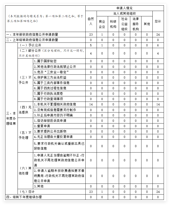 本年度報告根據《中華人民共和國政府信息公開條例》(以下簡稱《條例》)、湖南省政務公開領導小組辦公室《關于貫徹落實(中華人民共和國政府信息公開條例)實施方案》(以下簡稱《實施方案》)及《懷化市政府信息公開實施細則》(以下簡稱《細則》)的有關規定,由鶴城區政務公開領導小組辦公室編制。全文由總體情況、主動公開政府信息情況、收到和處理政府信息公開申請情況、政府信息公開行政復議行政訴訟情況、存在的主要問題及改進措施、其他需要報告的事項等六部分組成。本報告的統計數據時限為2024年1月1日至12月31日,通過懷化市鶴城區人民政府門戶網站對外公布。如對報告有任何疑問、意見,請與懷化市鶴城區政務服務中心聯系(地址:懷化市鶴城區政務服務中心五樓501室,郵編:418000,電話:0745-2338221,電子郵箱:hcqzwzx@126.com)。